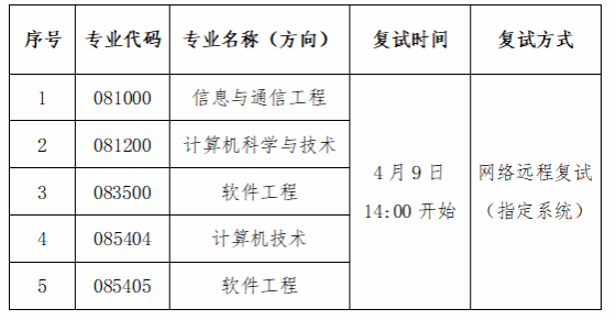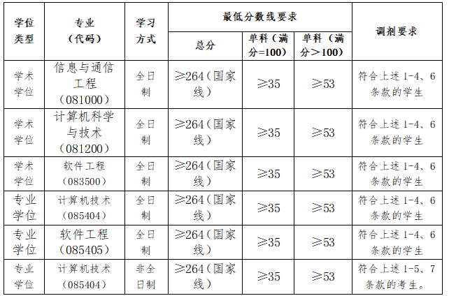 所有可调剂专业要求考生一志愿报考专业为信息与通信工程(081000)、计算机科学与技术(081200)、软件工程(083500)、通信工程(085402)、计算机技术(085404)、软件工程(085405)。