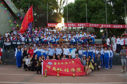 最终以47分的成绩位列团体总分第10名。万明书记、罗玉峰校长、信息学院党委副书记何仲坚、信息学院团委书记陈文锦同信息学院运动员及工作人员合影,望运动员继续努力,来年再创佳绩。