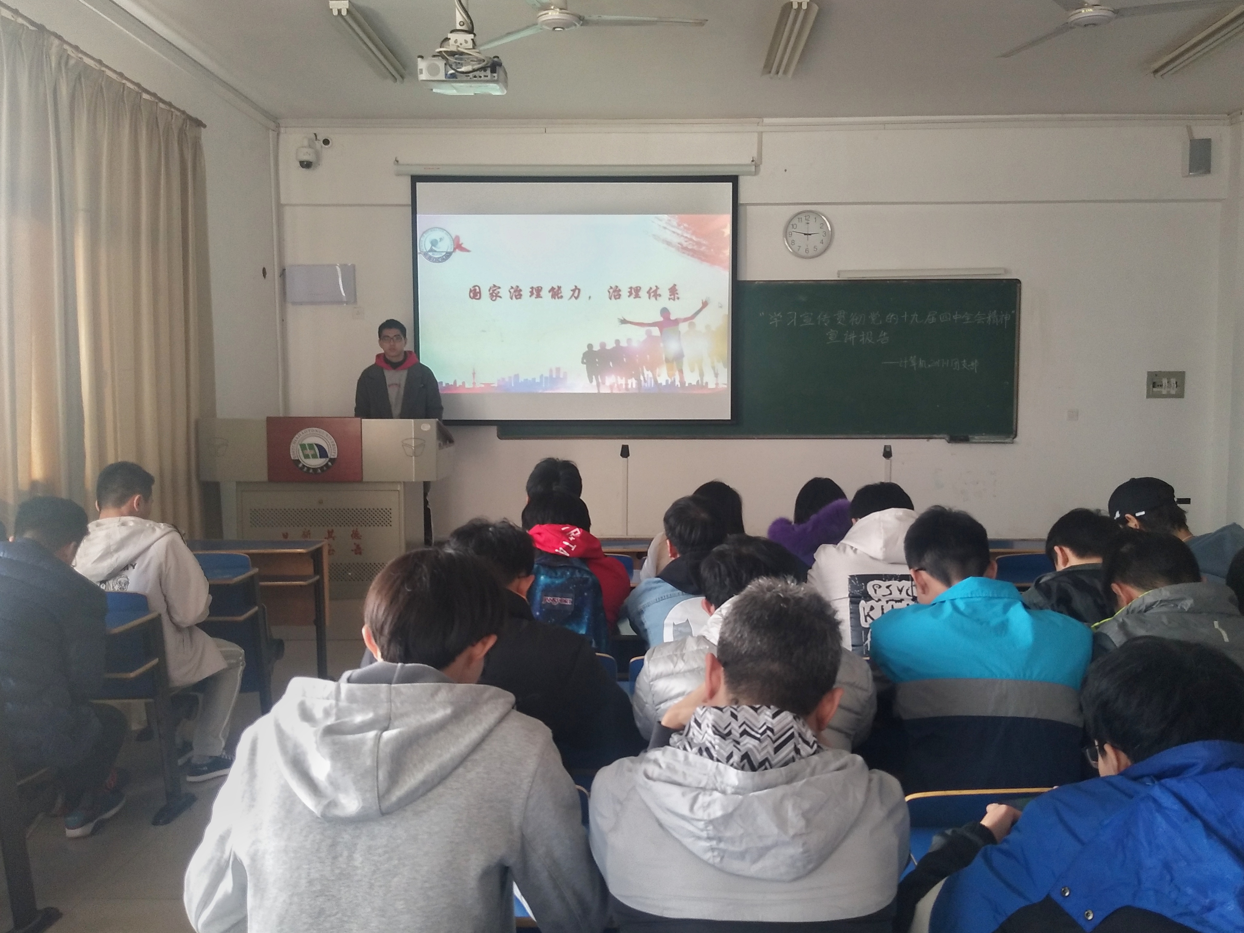 活动伊始,班长刘军东宣读全会通过的《中共中央关于坚持和完善中国特色社会主义制度、推进国家治理体系和治理能力现代化若干重大问题的决定》这一文件,并由其他班委分别从国家治理体系、行政体制、经济制度、和平外交政策……多方面对文件内容进行详细说明,总结回顾党的十九届三中全会以来我国各项事业所取得的重大进展和成果。