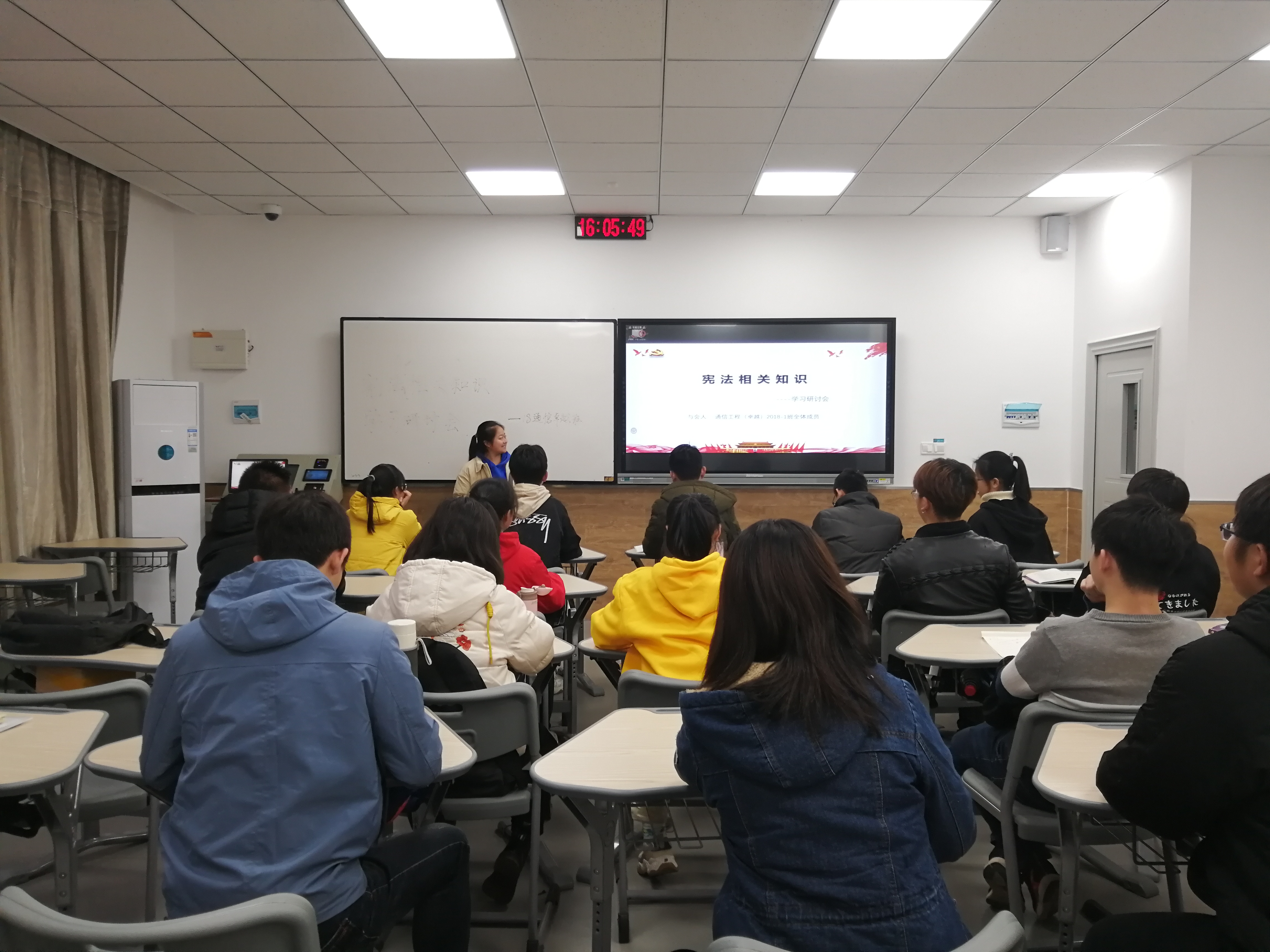 为使各团支部同学了解宪法宣传周及学习宪法,近日,信息工程学院2018级通信工程三班、卓越班分别于逸夫楼209室和25栋318室举办宪法知识主题研讨班会。18级通信工程卓越班团支书王佳欣担任卓越班主讲人,通信三班团支书曹婷担任三班主讲人。