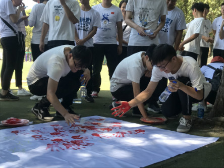 随后的活动中,17级计算机专业班委成员准备了红色和黄色油墨,并邀请每一位同学在铺好的白色塑料布上印下自己的手印,随着时间推移,一面巨幅国旗渐渐展现出它的相貌;与此同时,南区田径场上同学们自发摆起“1949”和“2019”字样,也突出展示了祖国七十年风雨历程中的种种变迁。
