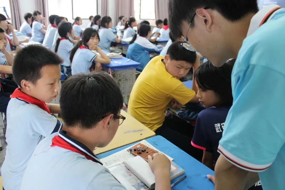 促进团成员结合自身专业知识为孩子们答疑解惑,并进行科技科普,讲授了计算机基础知识,还演示了光立方、烘干机和八路抢答器等实验室成品。“我从那些孩子们的眼中看到了对科学知识的渴望与向往,很高兴也很幸运能给他们进行科普。”促进团成员何宇赫说。
