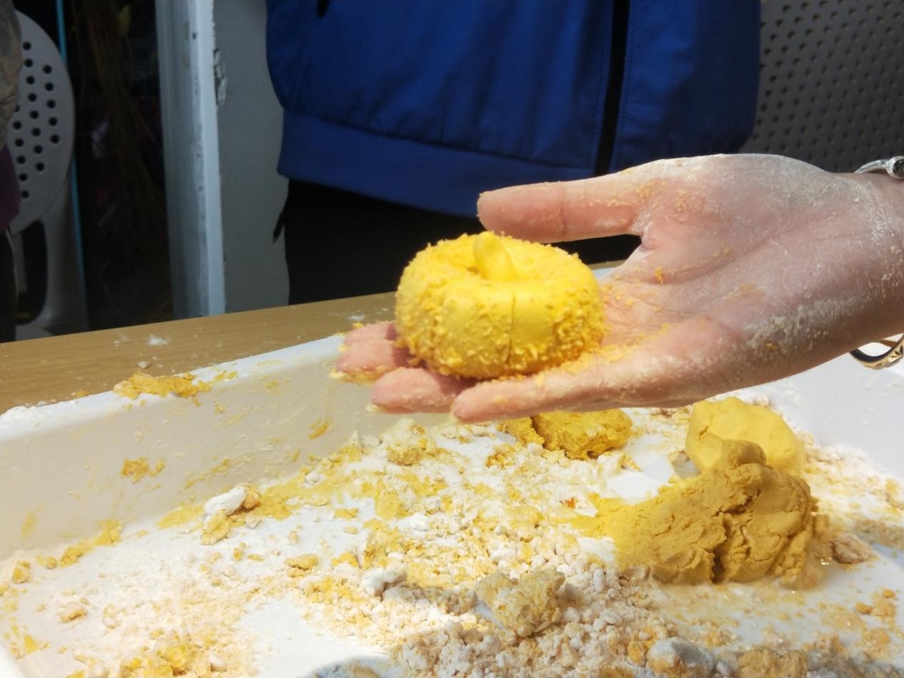 活动以“手工制作感恩节传统食物——南瓜饼”的形式展开,分为“南瓜饼制作”和“食物分享”两个环节。南瓜饼制作中,同学们在劳动中互帮互助,气氛温馨。揉、搓、按、捏,学生的指法由笨拙到熟练,将糯米粉和蒸熟了的南瓜或成面团。通过蒸煮炸,一个个不成形的面团摇身一变为淡黄色的夹心南瓜饼。学生将制作完成的南瓜饼送给辅导员艾国金,以表达学生们的感恩之情。此外,学生还将制作完成的南瓜饼分享给食堂的工作人员。