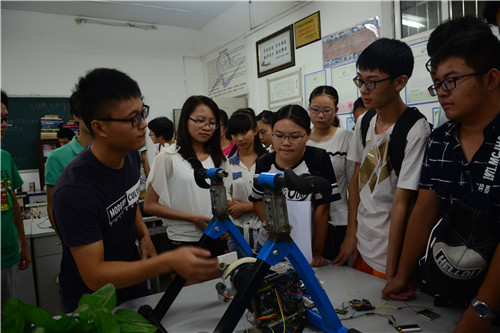 当志愿者带领新生走进通信电子实验基地的时候,新生瞬间被里面各种“奇怪”的作品吸引了,“这个是我们自己做的作品:《多功能智能浇花装置》,作为江西省推荐参赛的队伍之一,我们学院代表队的作品于今年6月荣获江西省计算机作品赛特等奖”15级熊建军说。