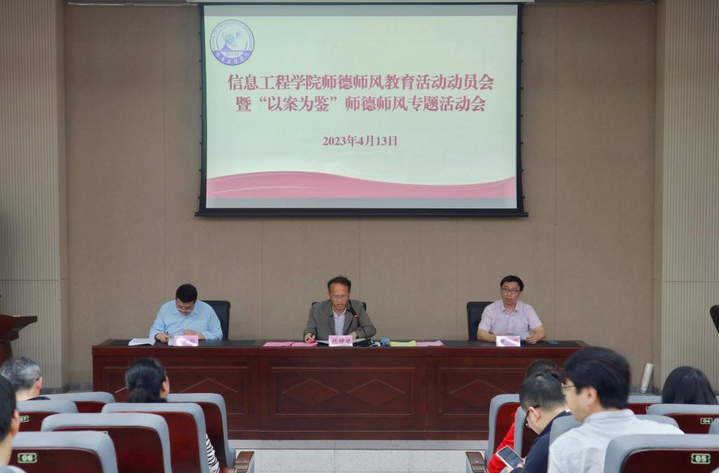 为全面贯彻习近平总书记关于师德师风重要批示精神,进一步加强全院教职工师德师风建设,4月13日,信息工程学院于教5栋108校友学术报告厅组织召开师德师风教育活动动员暨“以案为鉴”师德师风专题活动会,院党委书记何仲坚、副院长罗晖、姜楠等领导班子成员出席,学院全体教职工参加会议。