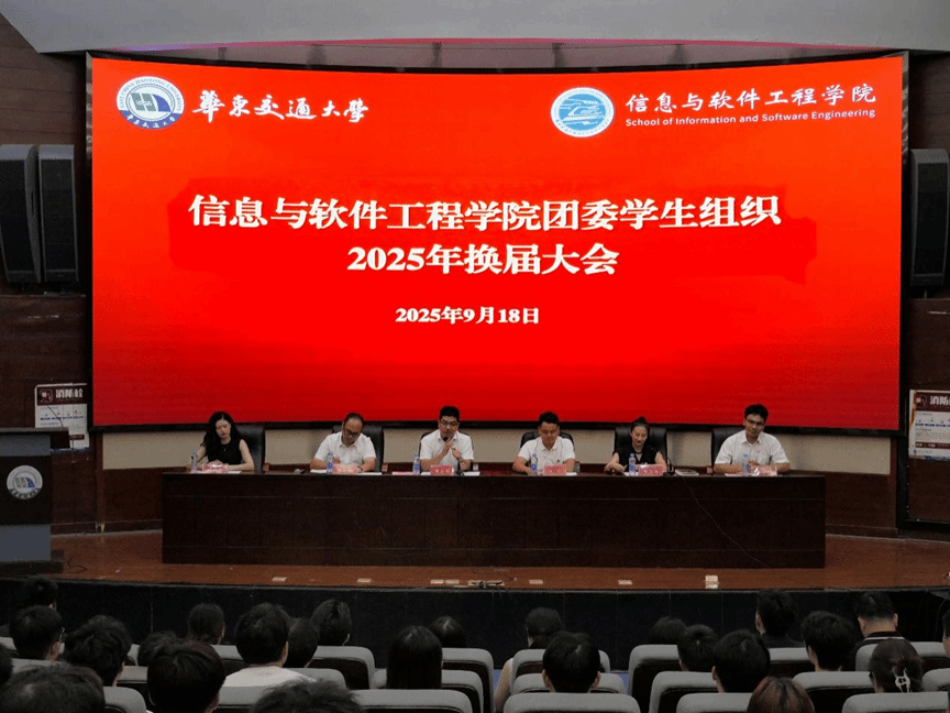 为系统总结上一届团学工作成果,顺利完成新老学生骨干工作交接,传承服务宗旨与使命,进一步凝聚青年力量、赋能学院发展,9月18日晚,信息与软件工程学院2025年团学组织换届大会在北区图书馆圆形报告厅隆重召开。校团委副书记高旭,学院党委书记魏永峰,党委副书记冯荣刚,团委副书记郭招男、肖志鹏、洪亚聪等出席会议。大会由院团委书记李萌萌主持。