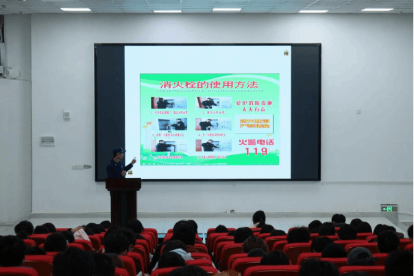 讲座中,黄改革指出,火灾发生时,务必保持冷静并采取正确的自救方法,将其归纳为两方面,一是准确报警,为生命争取时间;二是理性逃生,牢记安全第一。他结合生活案例及课件照片,介绍了专业的救援力量和救援体系,向副班长和参会同学系统的介绍了消火栓等基础消防用具的使用方法。