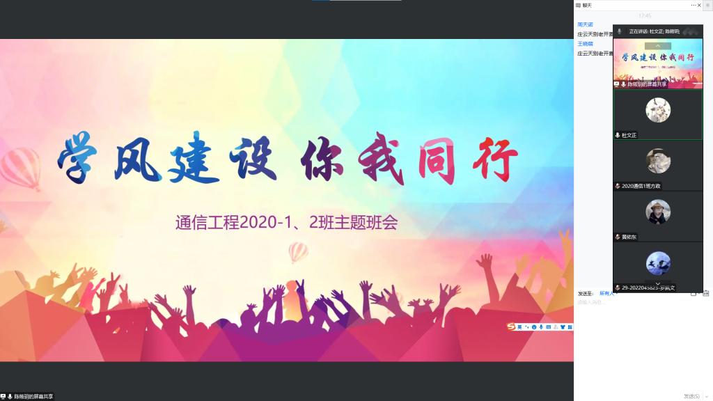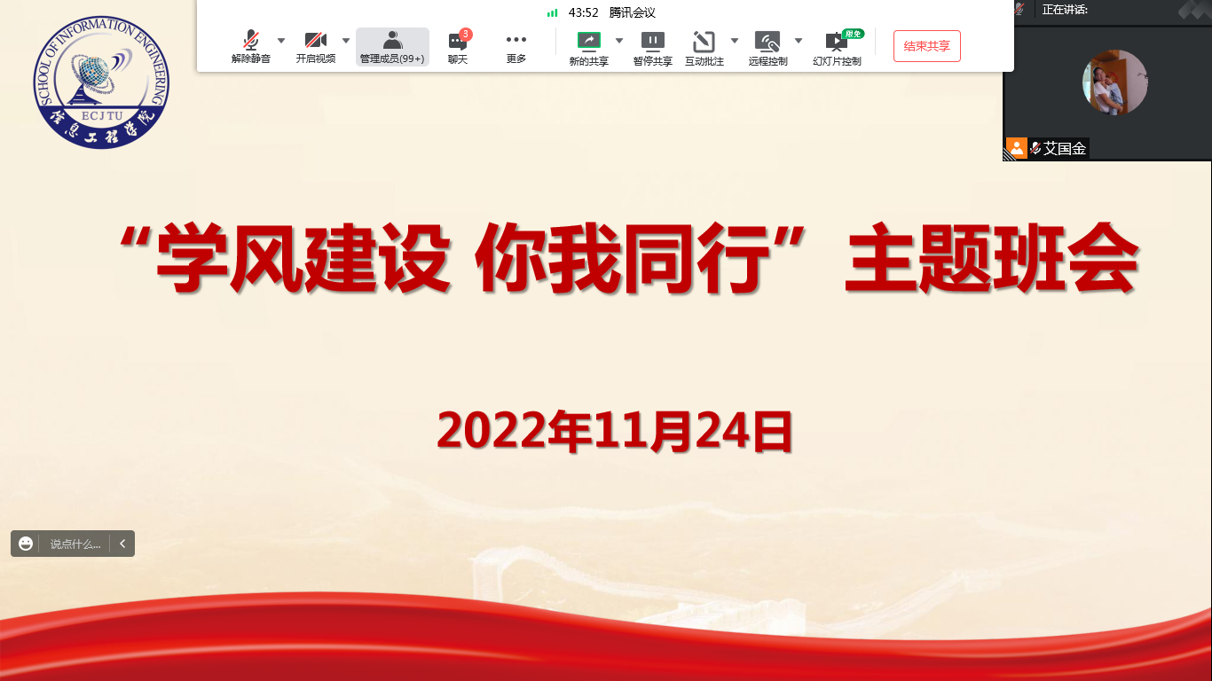 为贯彻落实学工处下发的《关于开展2022年“学风建设月”活动的通知》精神以及《关于开展“我的大学我做主”学风建设月活动的通知》有关要求,打造文明宿风,塑造健康班风,营造优良院风,学院全体辅导员组织学生召开“学风建设 你我同行”主题班会。