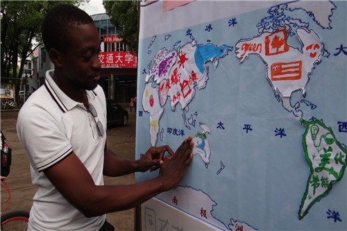 参与者们抽签分为七组,分配不同形状卡片对应“七大洲”。比赛开始,各组“你画我猜”,猜出本组所对应的大洲,之后进行“定向越野”环节,寻找大洲所对应的颜色。“环保知识问答”、“绘制七大洲”、“拼凑七大洲”,各组成员需逐一闯关,并返回起点将画有代表各大洲特色的卡片贴在展板上。来自非洲喀麦隆的朋友尽管语言不通,但在志愿者的“翻译”与队员的手语帮助下,最终将画有蓝色袋鼠的大洋洲板块贴在起点的世界地图上。