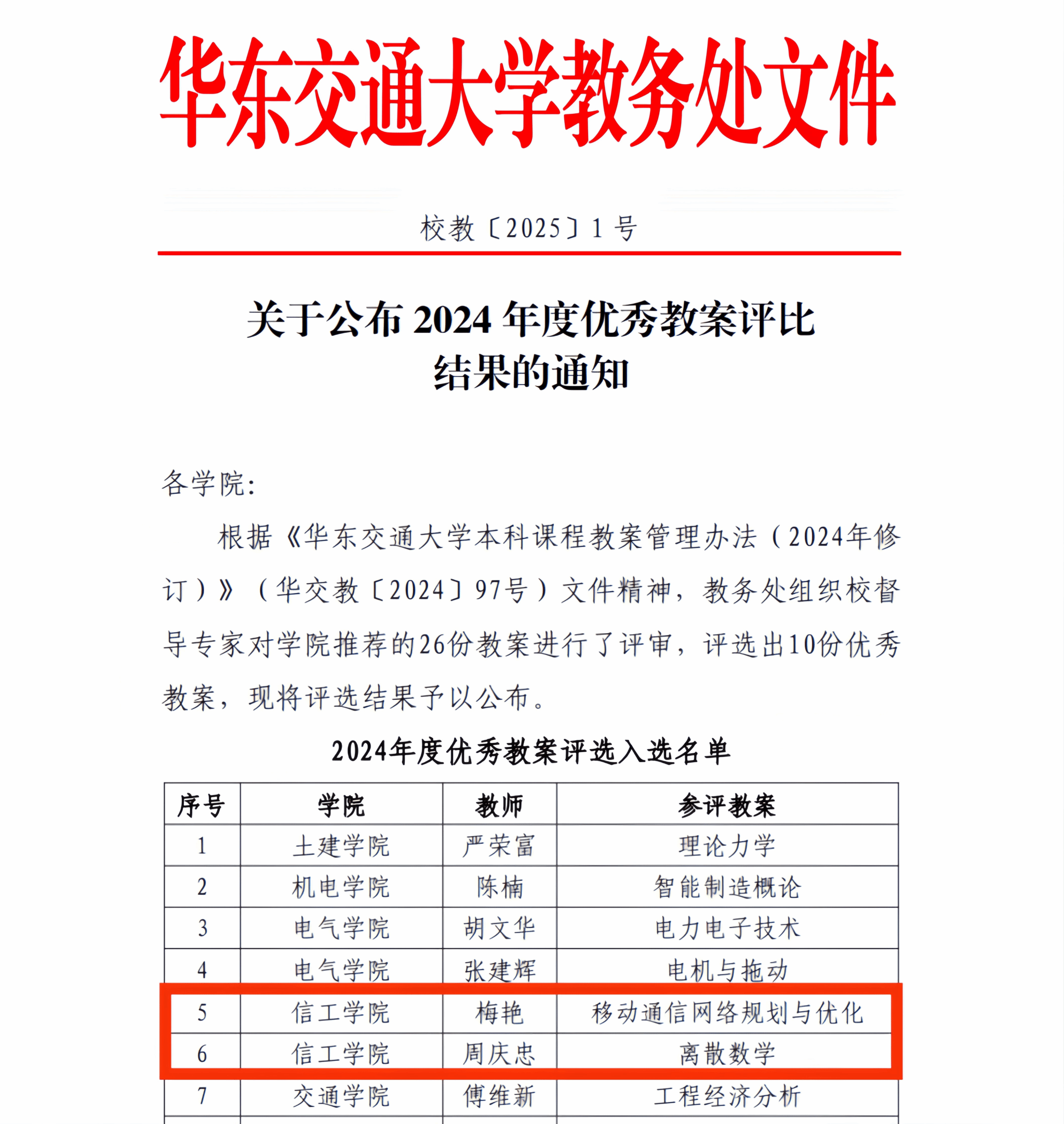梅艳老师《移动通信网络规划与优化》课程教案与周庆忠老师《离散数学》课程教案双双入选优秀教案榜单。